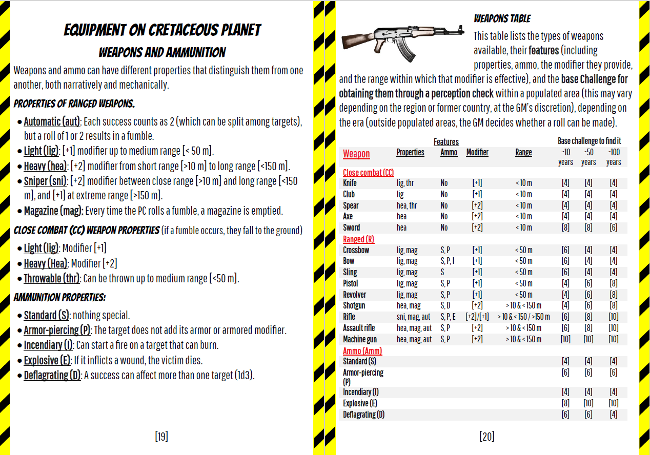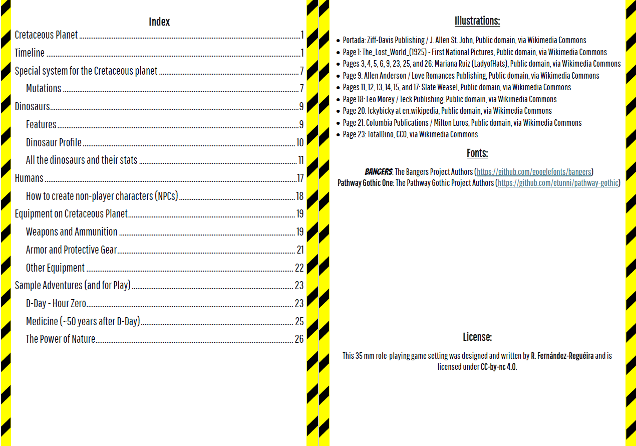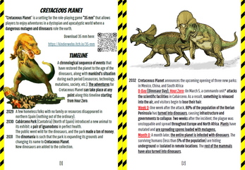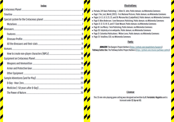 Cretaceous Planet is a setting for “35 mm,” a free, easy-to-play generic role-playing game, designed for adventures in a dystopian, apocalyptic world where a dangerous mutagen and dinosaurs rule the earth.