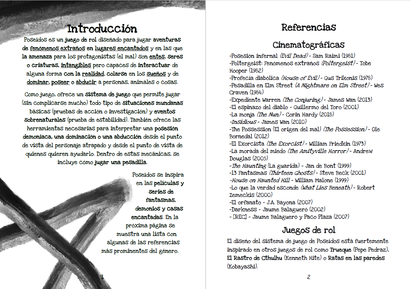 Poseídos es un juego de rol diseñado para jugar aventuras de fenómenos extraños en lugares encantados y en las que la amenaza para los protagonistas (el mal) son entes, seres o criaturas, intangibles pero capaces de interactuar de alguna forma con la realidad, colarse en los sueños y de dominar, poseer o abducir a personas, animales o cosas.
